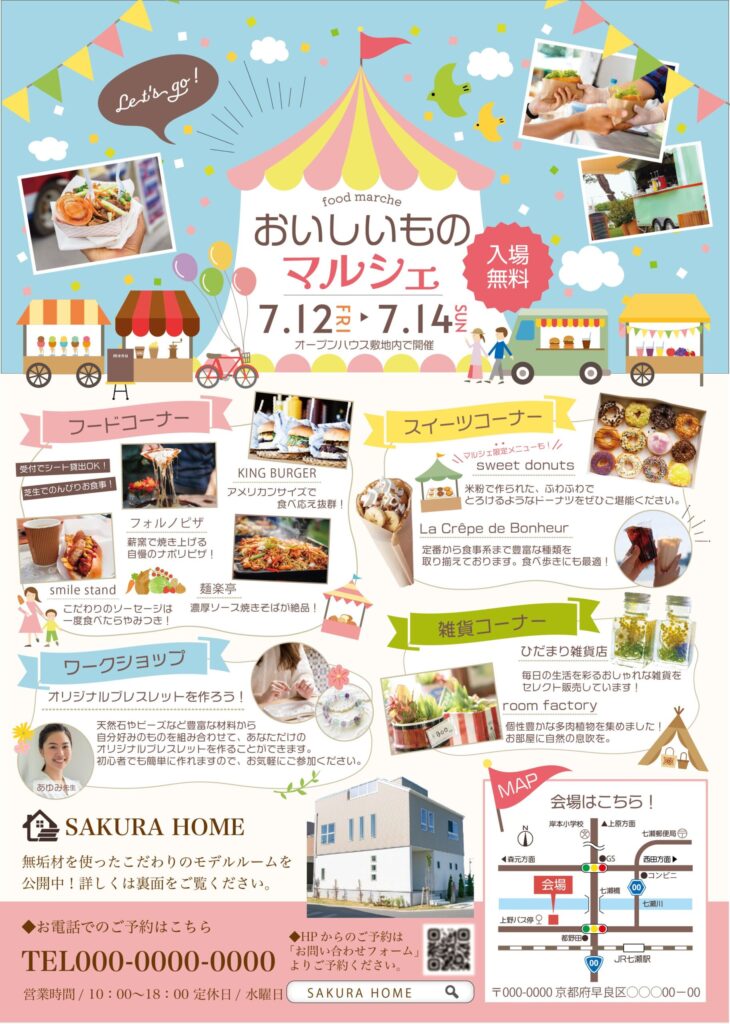 地域イベント「おいしいものマルシェ」のチラシをデザインしました。
